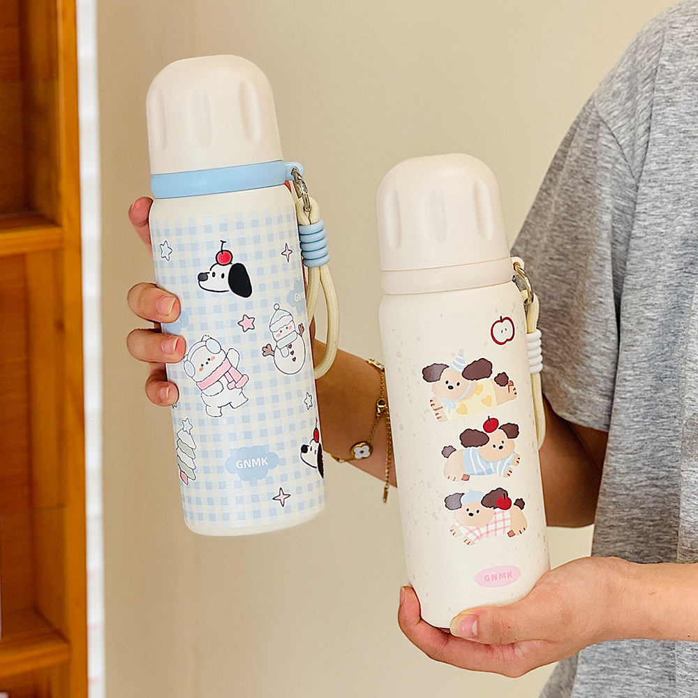This vacuum flask features adorable cartoon patterns like cute animals, snowmen, and stars on a checkered background. It comes with a convenient carrying strap for easy portability. Multiple styles with different cartoon designs and color schemes are available, so you can pick the one that matches your taste.